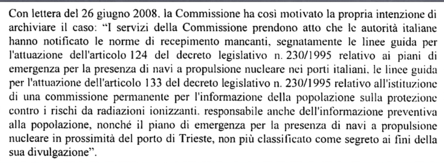 Così, lo status del porto nucleare di Trieste è emerso soltanto nel 2003 a seguito delle denunce che vennero presentate dal sottoscritto alla Commissione Europea sull’inesistenza del Piano di Emergenza Esterna del porto nucleare di Trieste (l’intera vicenda è raccontata nel libro-inchiesta “Tracce di Legalità – come le mafie e le corruzioni italiane inquinano l’attuale Territorio Libero di Trieste”).